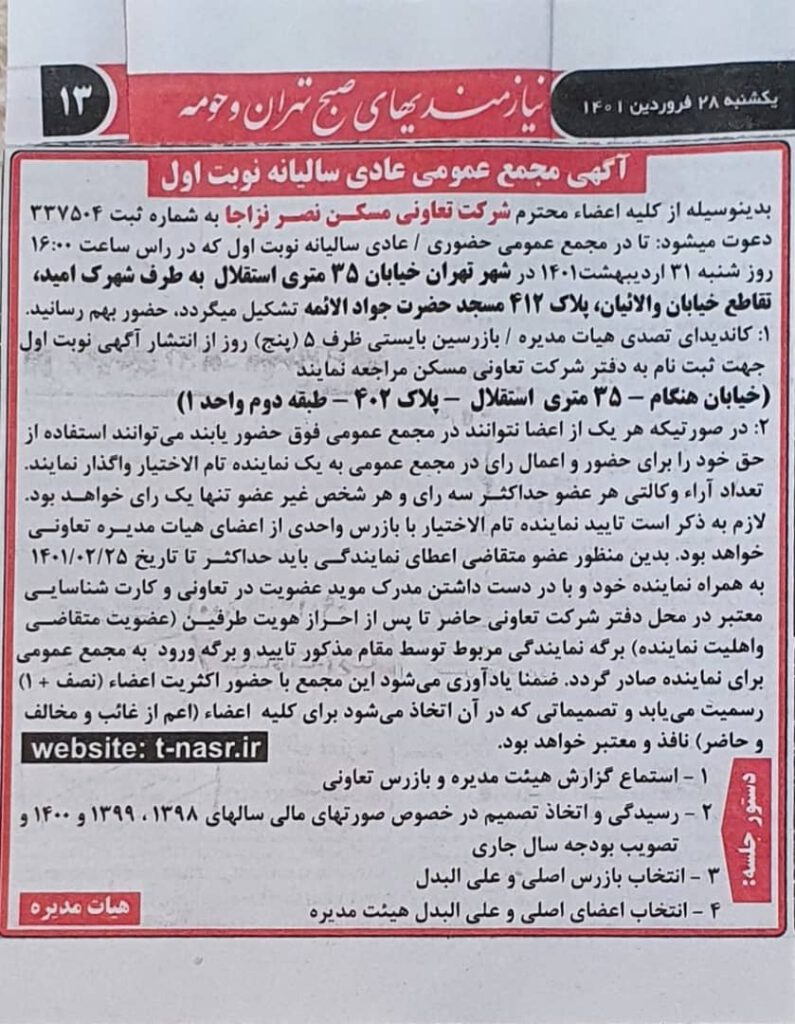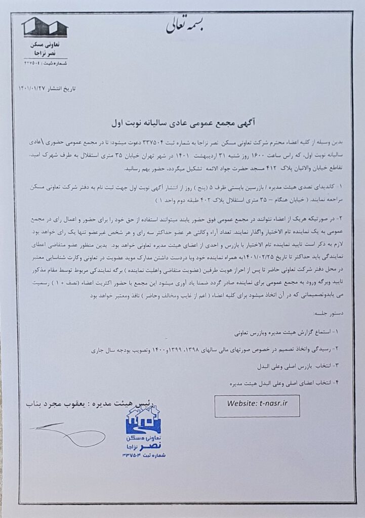 بدین وسیله از کلیه اعضا محترم تعاونی مسکن نصر نزاجا به شماره ثبت 337504 دعوت می شود تا در مجمع عمومی عادی سالیانه نوبت اول که راس ساعت 16 روز شنبه 31 اردیبهشت 1401 در آدرس تهران- خیابات 35 متری استقلال- تقاطع خیابان والائیان پلاک 412 مسجد حضرت جوادالائمه تشکیل می گردد حضور بهم رسانید…
