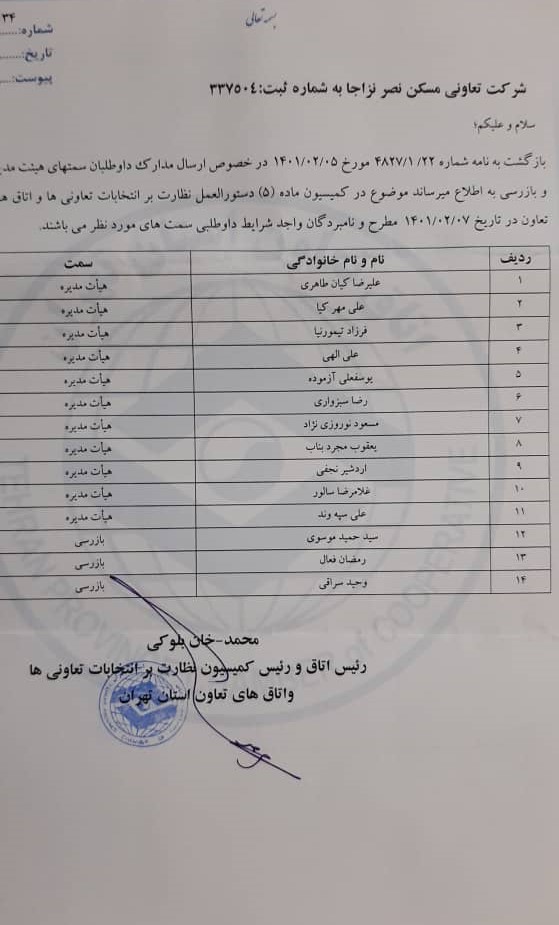 اسامی دواطلبان هیئت مدیره انتخابات تعاونی مسکن نصر نزاجا