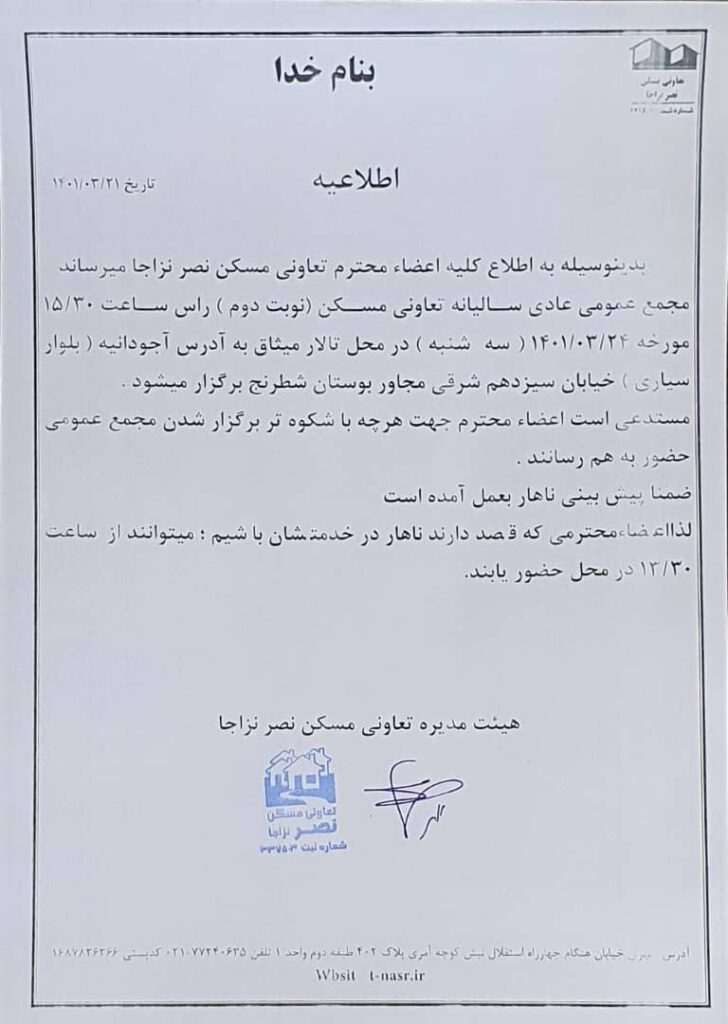 تاریخ و مکان جلسه مجمع عمومی نوبت دوم تعاونی مسکن نصر نزاجا