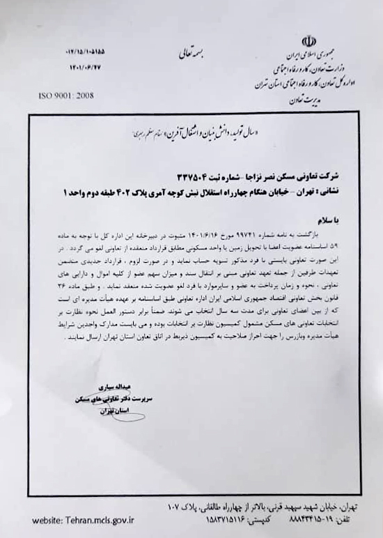 استعلام نحوه عضوبت اعضای تعاونی از وزارت تعاون oxin-manage2022-10-22T21:55:37+03:30 با توجه به ماده 59 اساسنامه عضویت اعضا با تحویل زمین یا واحد مسکونی مطابق قرارداد منعقده از تعاونی لغو می گردد…