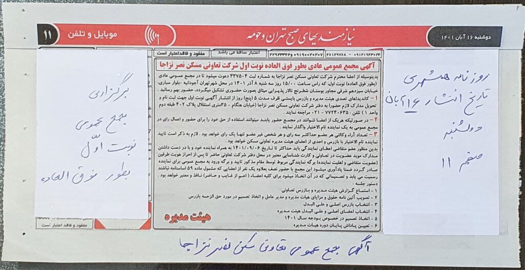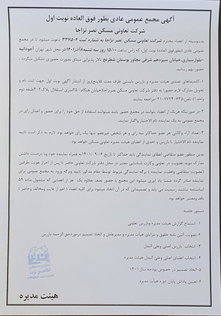 آگهی مجمع عمومی عادی بطور فوق العاده نوبت اول شرکت تعاونی نصر نزاجا oxin-manage2022-11-07T23:42:42+03:30 متن آگهی چاپ شده در روزنامه های سراسری به همراه آگهی مجمع عمومی که در تاریخ 8 آذرماه برگزار خواهد شد.