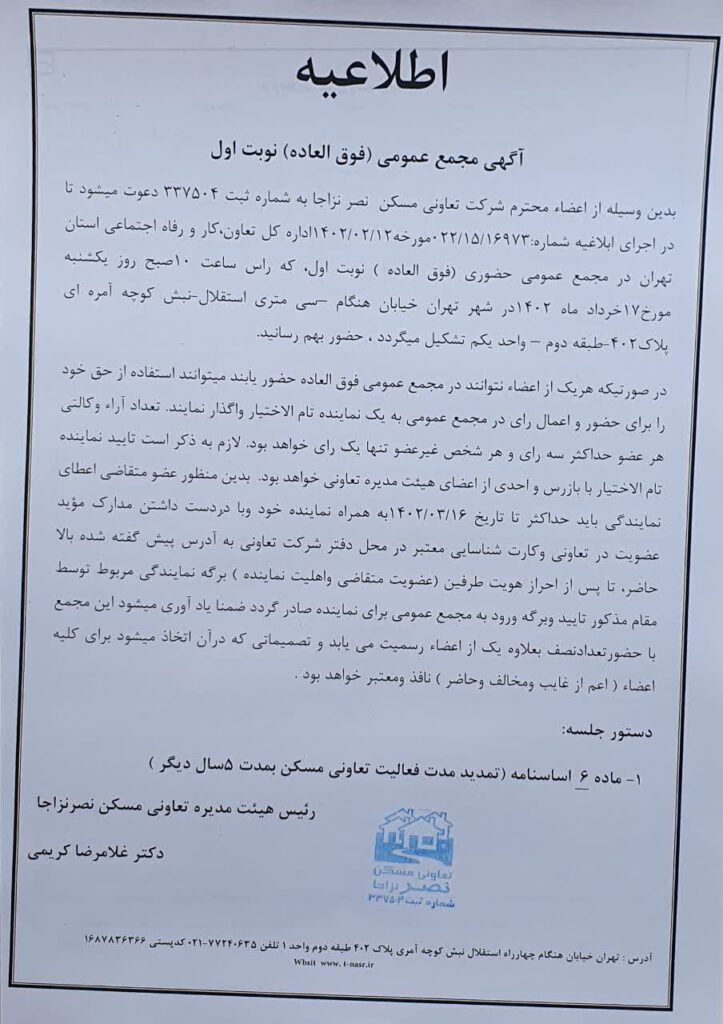 آگهی مجمع عمومی مورخ 17 خرداد 1402 در محل تعاونی