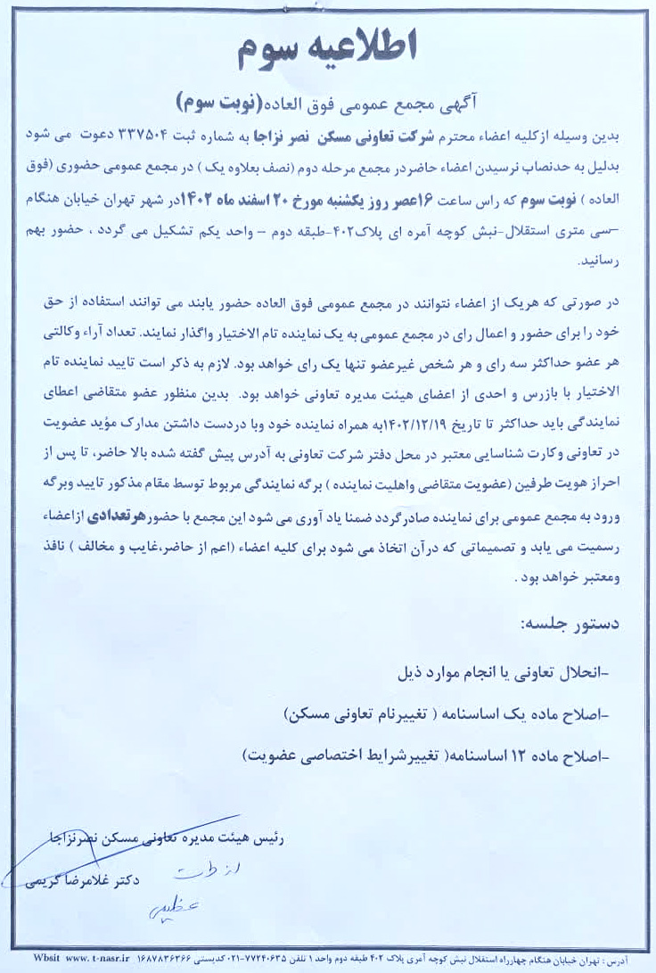 اطلاعیه مجمع عمومی فوق العاده (نوبت سوم) در تاریخ 20 اسفند 1402