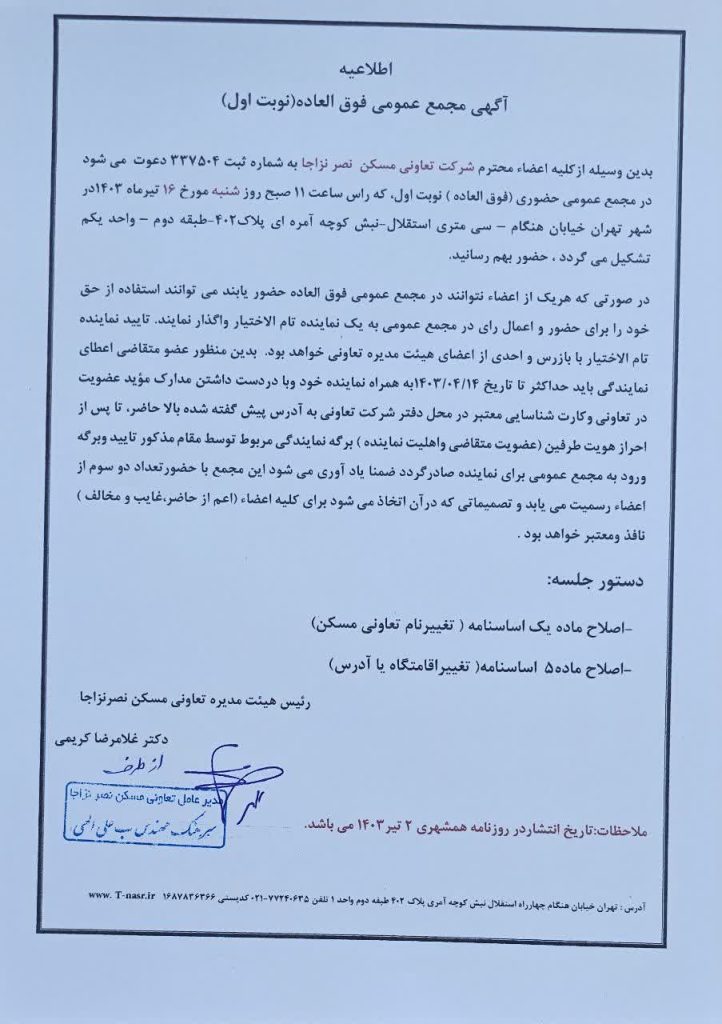 آگهی مجمع عمومی فوق العاده (نوبت اول) مورخه 16 تیرماه 1403